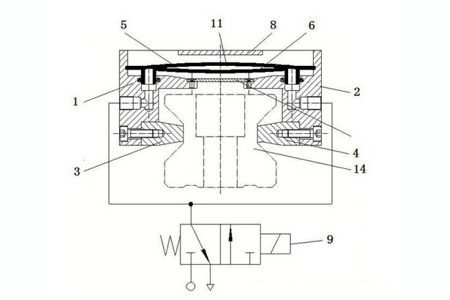 1、右座體 2、左鎖緊片 3、右鎖緊片 4、上彈簧鋼片 5、下彈簧鋼片 6、彈簧片 7、限位凸臺 8 和電磁閥 9,左座體和右座體相對鏡像設置,左座體和右座體上方中心設有限位凸臺 8,左座體 1 和右座體 2 經彈簧片 7 固定連接,左座體 1 和右座體 2 上端中心設有彈簧鋼片腔 12,下端中心設有線軌滑塊移動腔 13,下端一側與左鎖緊片 3固定連接,另一側與右鎖緊片 4固定連接,左座體 1 和右座體 2 外側壁上分別設有氣體通道 10,限位凸臺分別與左座體和右座體固定連接,左鎖緊片 3 和右鎖緊片 4 相對設置,以利于對線軌滑塊進行夾緊制動,彈簧鋼片腔內設有由上彈簧鋼片 5 和下彈簧鋼片 6 周邊密封連接而形成彈簧伸縮囊 11,彈簧伸縮囊 11 一端與左座體 1 固定連接,另一端與右座體 2 固定連接,上端與限位凸臺 8 相抵觸,下端與彈簧片 7 相抵觸,彈簧伸縮囊 11 上設有壓縮空氣出入口,氣體通道 10 一端與壓縮空氣出入口相連通,另一端與氣源相連通,以使彈簧伸縮囊 11內填充有壓力氣體,氣體通道 10上設有電磁閥 9,以利于通過電磁閥 9自動控制彈簧伸縮囊 11 內的氣體含量,使彈簧伸縮囊 11 帶動左座體 1 和右座體 2 相對移動或相背移動,進而實現自動調整左鎖緊片 3 和右鎖緊片 4 對線軌滑塊進行自動夾緊制動的作用。