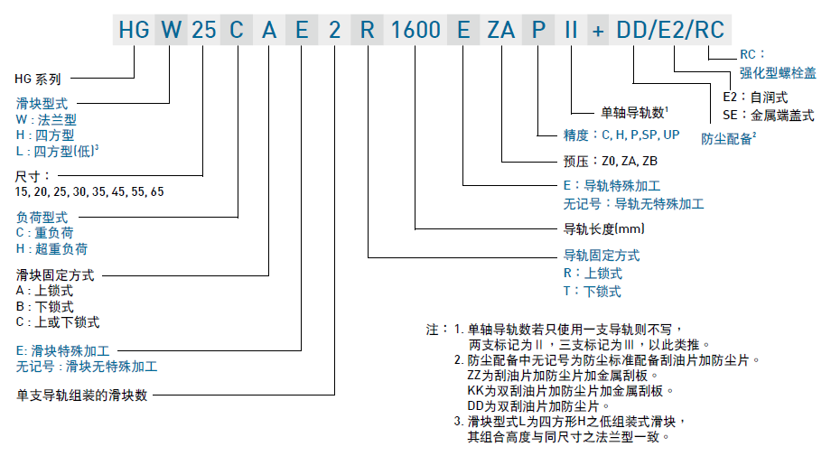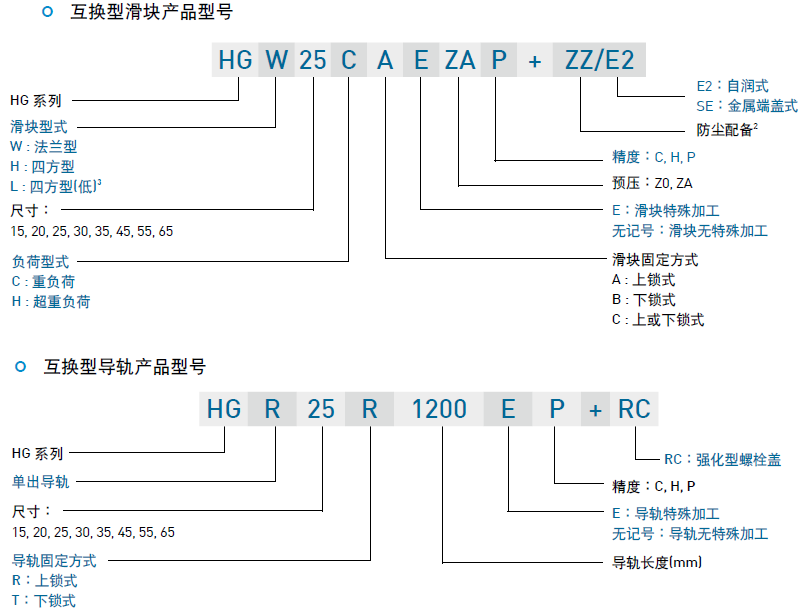 HG系列分為非互換性及互換性型兩種直線導軌,兩者規格尺寸相同,主要差異點在于互換性型之滑塊、導軌可單出互換使用,較便利,但其組合精度無法達到非互換性型之超高精度,不過由于HIWIN在制造上有良好的尺寸控制及嚴格的質量要求,互換性型之組合精度目前已達到一定的水平,對不需配對安裝直線導軌的客戶而言是一項很好的選擇。直線導軌的產品規格型號主要標明直線導軌尺寸、型式、精度等級、預壓等規格要求,以利訂貨時雙方對產品的確認。