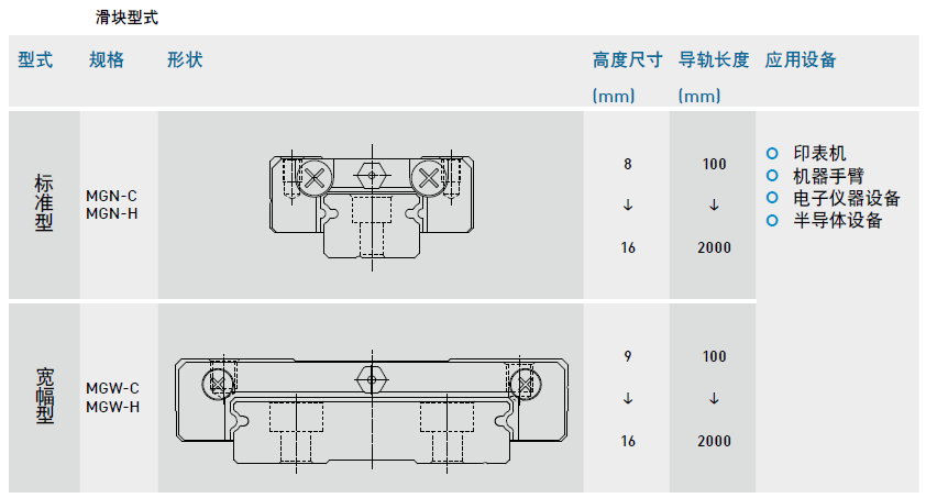 HIWIN提供標準型及寬幅型兩種直線導軌,方便客戶選型使用。